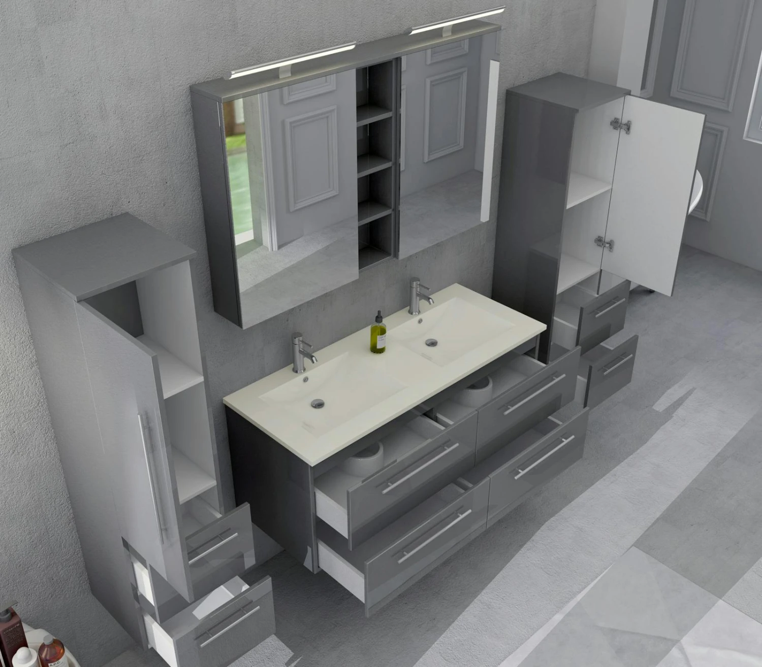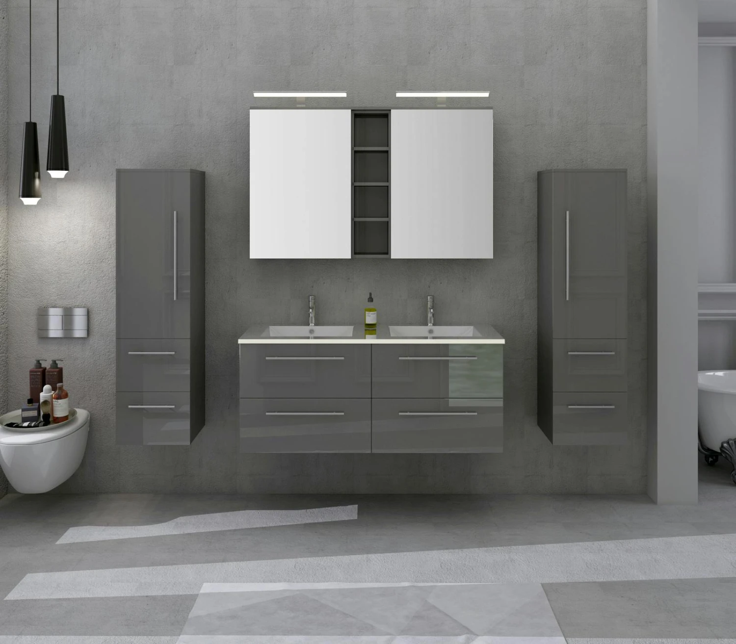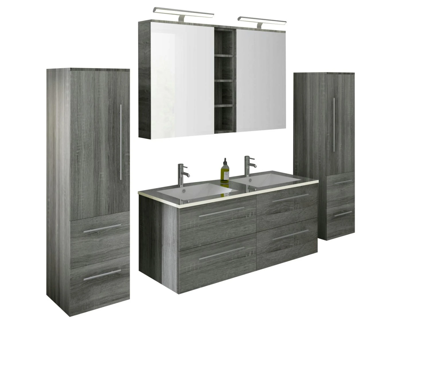 Genießen Sie die Auszeit in Ihrer kleinen Wellness-Oase mit diesem geschmacksvollen Badezimmer Set. Nicht nur das Design, sondern auch die Funktionalität werden Sie überzeugen. Die Doppelwaschbecken sind edel und ausgefallen, zudem sparen sie durch ihre spezielle Form auch noch Wasser. Das morgendliche Anstehen hat somit ein Ende. In dem großzügigen Spiegelschrank finden Sie genügend Platz für Schminksachen, Deos, Zahnbürsten und dergleichen. Das kleine Regal in der Mitte des Spiegelschranks kann als nützliche Ablage für Parfum dienen. In den Hängeschränken verbirgt sich genug Stauraum für Handtücher, Kosmetik- und Pflegeartikel. Die Soft-Close Funktion lässt alle Türen und Schubladen fast geräuschlos Schließen.