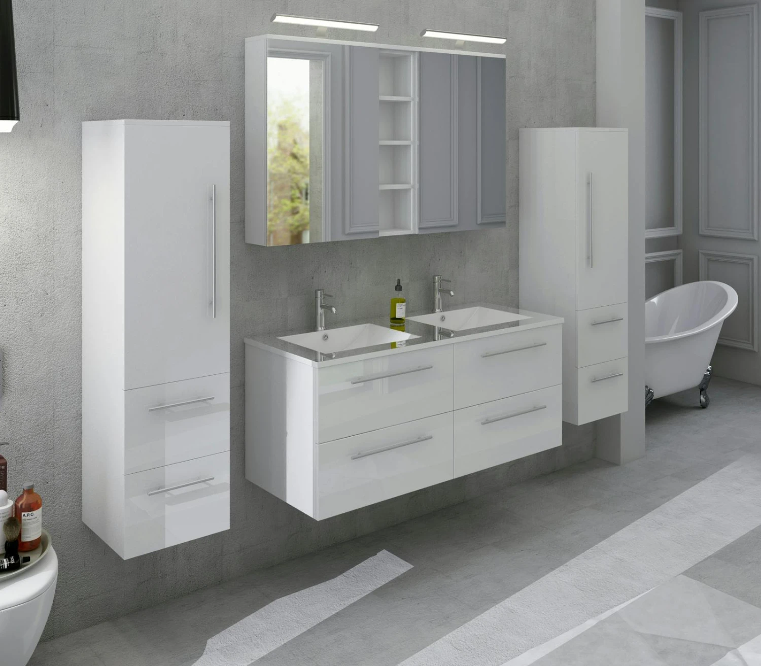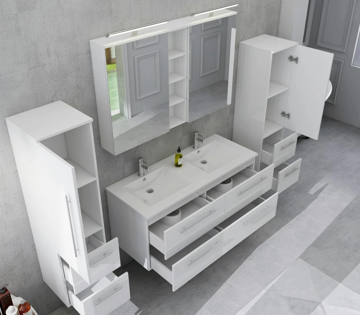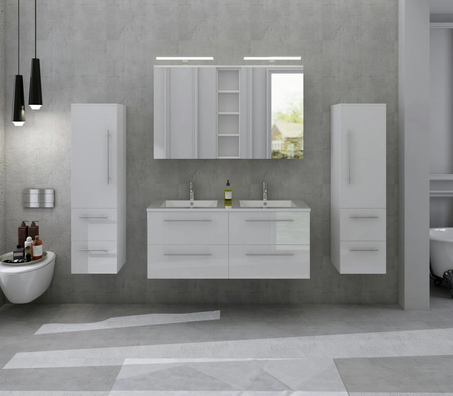 Genießen Sie die Auszeit in Ihrer kleinen Wellness-Oase mit diesem geschmacksvollen Badezimmer Set. Nicht nur das Design, sondern auch die Funktionalität werden Sie überzeugen. Die Doppelwaschbecken sind edel und ausgefallen, zudem sparen sie durch ihre spezielle Form auch noch Wasser. Das morgendliche Anstehen hat somit ein Ende. In dem großzügigen Spiegelschrank finden Sie genügend Platz für Schminksachen, Deos, Zahnbürsten und dergleichen. Das kleine Regal in der Mitte des Spiegelschranks kann als nützliche Ablage für Parfum dienen. In den Hängeschränken verbirgt sich genug Stauraum für Handtücher, Kosmetik- und Pflegeartikel. Die Soft-Close Funktion lässt alle Türen und Schubladen fast geräuschlos schließen.