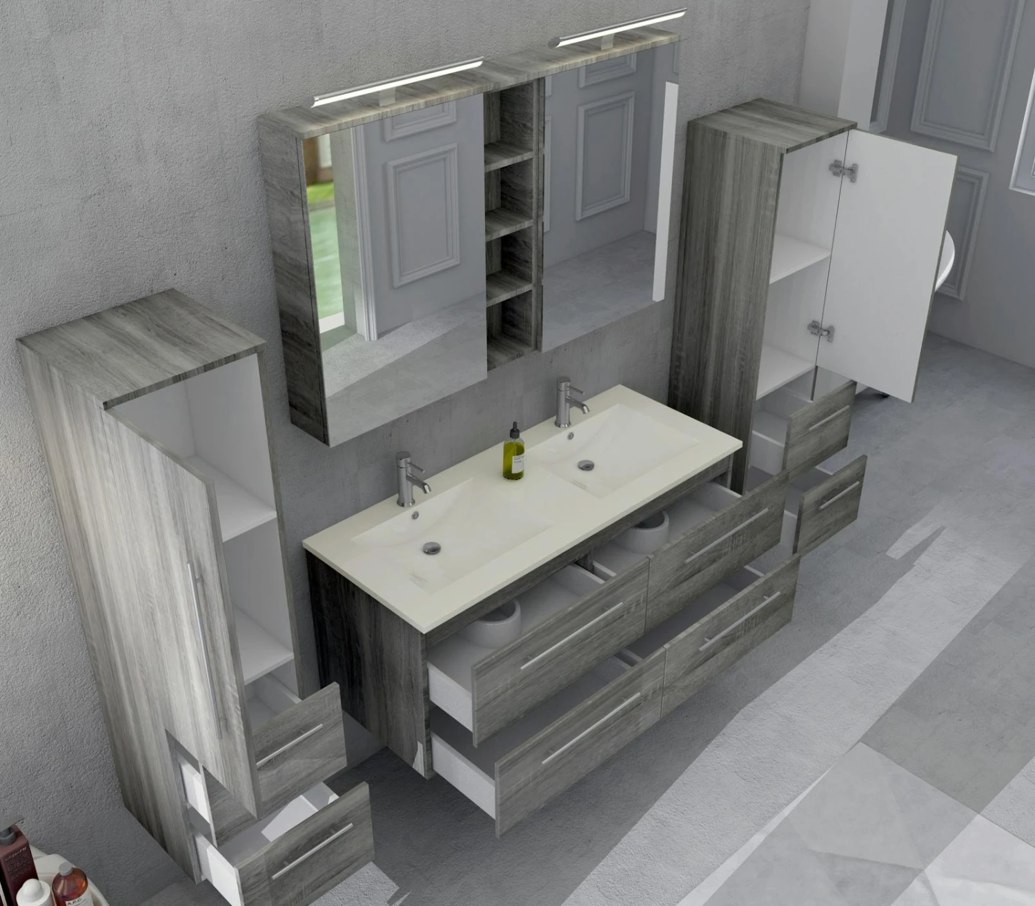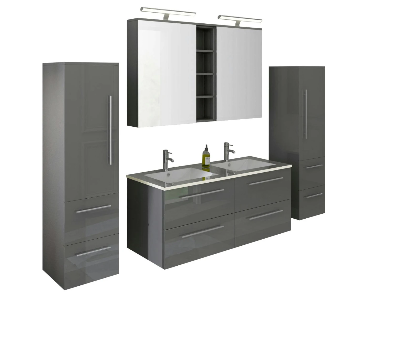 Genießen Sie die Auszeit in Ihrer kleinen Wellness-Oase mit diesem geschmacksvollen Badezimmer Set. Nicht nur das Design, sondern auch die Funktionalität werden Sie überzeugen. Die Doppelwaschbecken sind edel und ausgefallen, zudem sparen sie durch ihre spezielle Form auch noch Wasser. Das morgendliche Anstehen hat somit ein Ende. In dem großzügigen Spiegelschrank finden Sie genügend Platz für Schminksachen, Deos, Zahnbürsten und dergleichen. Das kleine Regal in der Mitte des Spiegelschranks kann als nützliche Ablage für Parfum dienen. In den Hängeschränken verbirgt sich genug Stauraum für Handtücher, Kosmetik- und Pflegeartikel. Die Soft-Close Funktion lässt alle Türen und Schubladen fast geräuschlos Schließen.