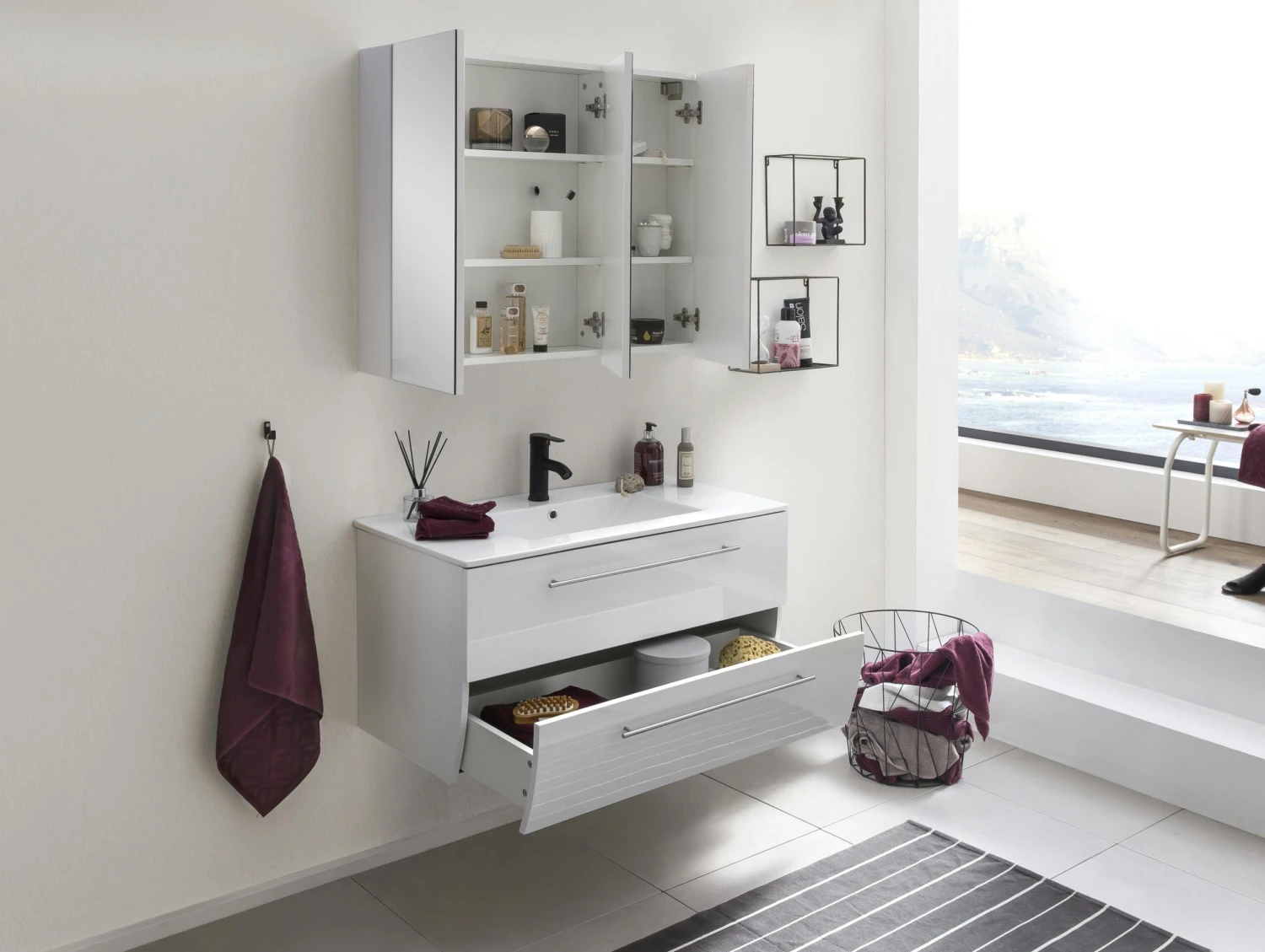 Genießen Sie die Auszeit in Ihrer kleinen Wellness-Oase mit diesem geschmacksvollen Badezimmer-Set. Nicht nur das Design, sondern auch die Funktionalität werden Sie überzeugen. Das Waschbecken ist edel und ausgefallen zugleich, zudem spart es durch seine spezielle Form auch noch Wasser. Der große Spiegelschrank ist zeitlos und modern. Er bietet hinter seinen drei Türen genügend Platz für z.B. Schminksachen und Zahnbürsten. Außerdem erleichtert er das tägliche Styling und die Gesichtspflege. Der Hängeschrank unterhalb des Waschtisches verfügt über genug Stauraum für Handtücher, Kosmetik- und Pflegeartikel. Alle Schränke sind mit der Soft Close Funktion ausgestattet – geräuschloses Schließen von Schubladen und Türen gehört ab sofort zum Alltag.