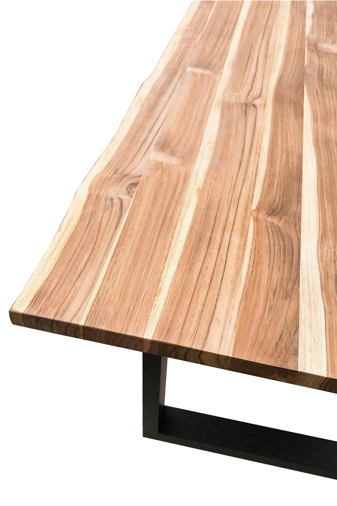 Massivholzmöbel gehören zu den zeitlos schönen Möbeln, die niemals aus der Mode kommen. Die 35 mm dicke Tischplatte besteht aus Teakholz und wurde aus echter Baumkante gefertigt. Das U-Gestell aus schwarz lackiertem Metall verleiht dem Tisch eine sehr gute Stabilität und ist das passende Gegenstück zur schönen naturfarbenen Tischplatte. Dieser Esszimmertisch ist mehr als nur ein Sitzplatz zum Essen. Holen Sie sich ein Stück Natur in die eigenen vier Wände. Da es sich bei diesem Massivholztisch um ein Naturprodukt handelt, kann es zu Astlöchern oder unterschiedlichen Farbschmückungen kommen, welche jedoch keine Fehler darstellen, sondern den individuellen Charakter des Echtholzes unterstreichen. Auch die Tiefe kann aufgrund der unregelmäßigen und asymmetrischen Formgebung um mehrere Zentimeter variieren. Alle diese Unterschiede machen diesen Esstisch zu einem echten Unikat.