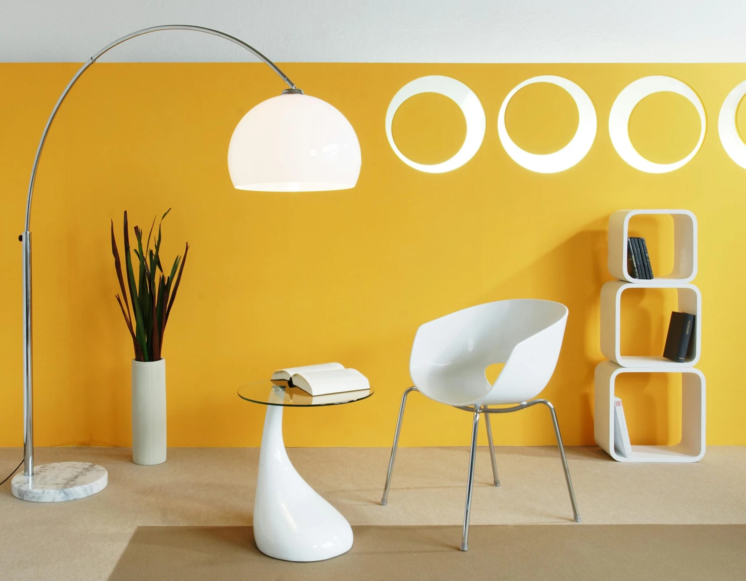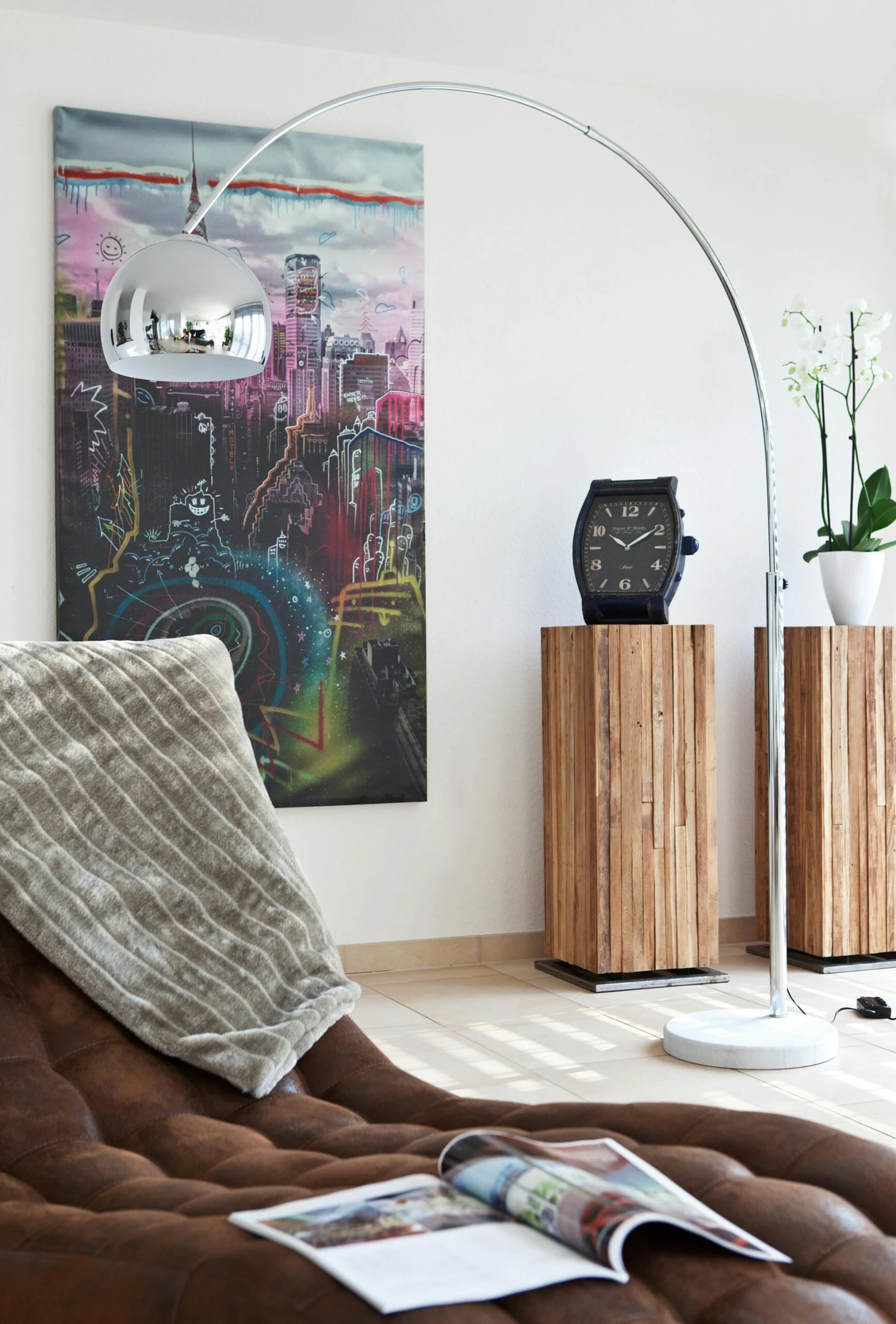 Die weiße Bogenlampe Big Deal steht für anspruchsvolles Lounge-Design im Stil der 60er- und 70er-Jahre. Auf dem Fuß aus echtem Marmor wird die Fußstange mit dem Bogen und dem kugelförmigen Schirm montiert.