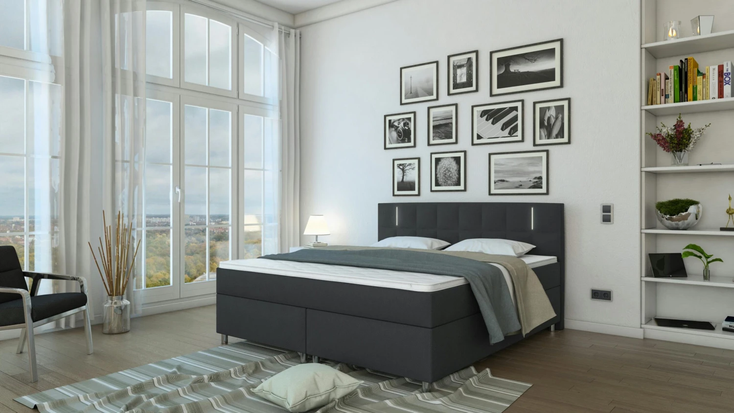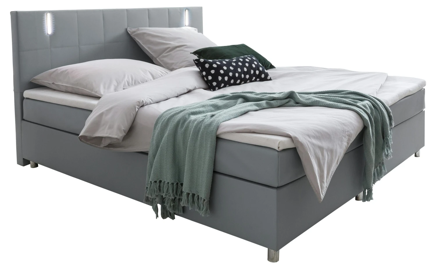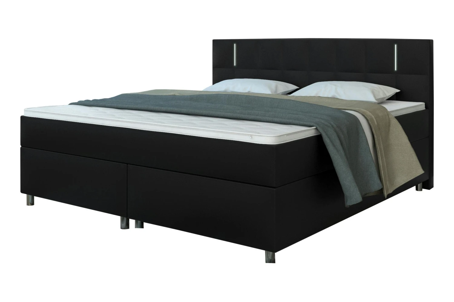 Das moderne Boxspringbett in schwarz überzeugt mit seinem All-Inklusiv Paket und einer bequemen Liegehöhe, welche das Aufstehen und Hinlegen so angenehm wie möglich macht. Der schicke Bezug besteht aus pflegeleichtem Kunstleder. Dieses Bett verfügt über zwei stabile Nosag-Federkern Boxen mit Unterfederung, einer durchgehenden Bonellfederkern-Matratze in H3 und einem 4 cm dicken Topper. Der durchgehende Topper ist waschbar, klimaregulierend, hautsympathisch und feuchtigkeitsregulierend. Das Bett verfügt über einen hohen Federkomfort mit optimaler Körperanpassung und Druckentlastung. Das hohe, gesteppte und gepolsterte Kopfteil mit moderner LED-Beleuchtung sorgt für lange Lese- und Fernsehabende. Erleben Sie einen Schlafkomfort der Extraklasse.