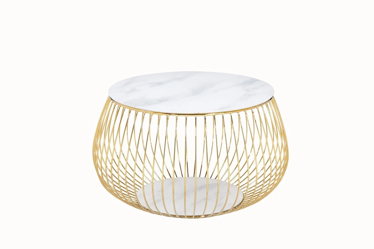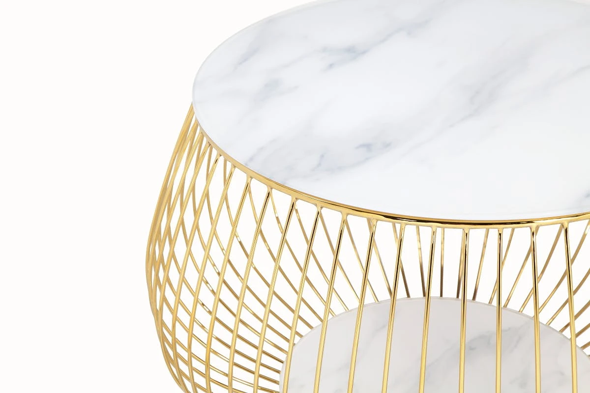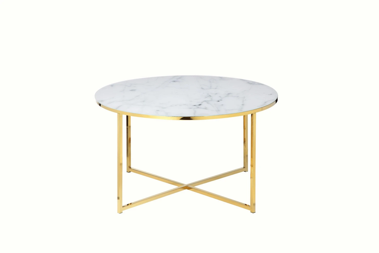 Der runde Couchtisch vereint modernes Design mit einer Portion Extravaganz. Die Kristallglasplatte mit Marmordruck passt perfekt zu dem goldfarbenen Gestell aus Metall. Der Sofatisch bietet genügend Ablagemöglichkeiten für z.B. Zeitschriften, Obst, Knabbereien oder eine Blumenvase. Durch sein attraktives Design und die runde Form ist dieser Couchtisch mit vielen Möbeln kombinierbar und findet auch in Ihrem Zuhause ein geeignetes Plätzchen. Die Oberfläche des Couchtisches ist sehr pflegeleicht und strapazierfähig. Kleinere Verschmutzungen können mit einem leicht feuchten Tuch entfernt werden.