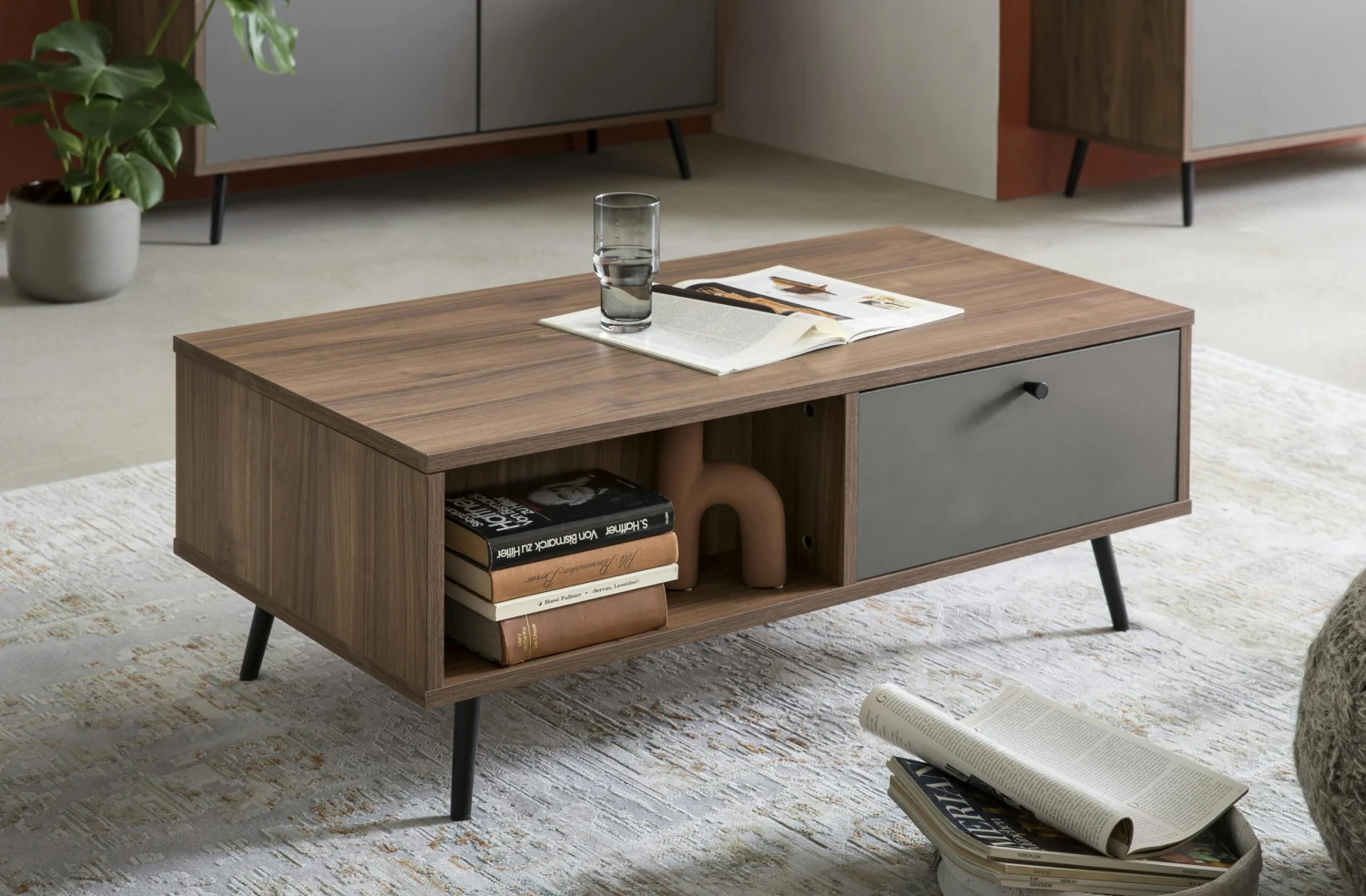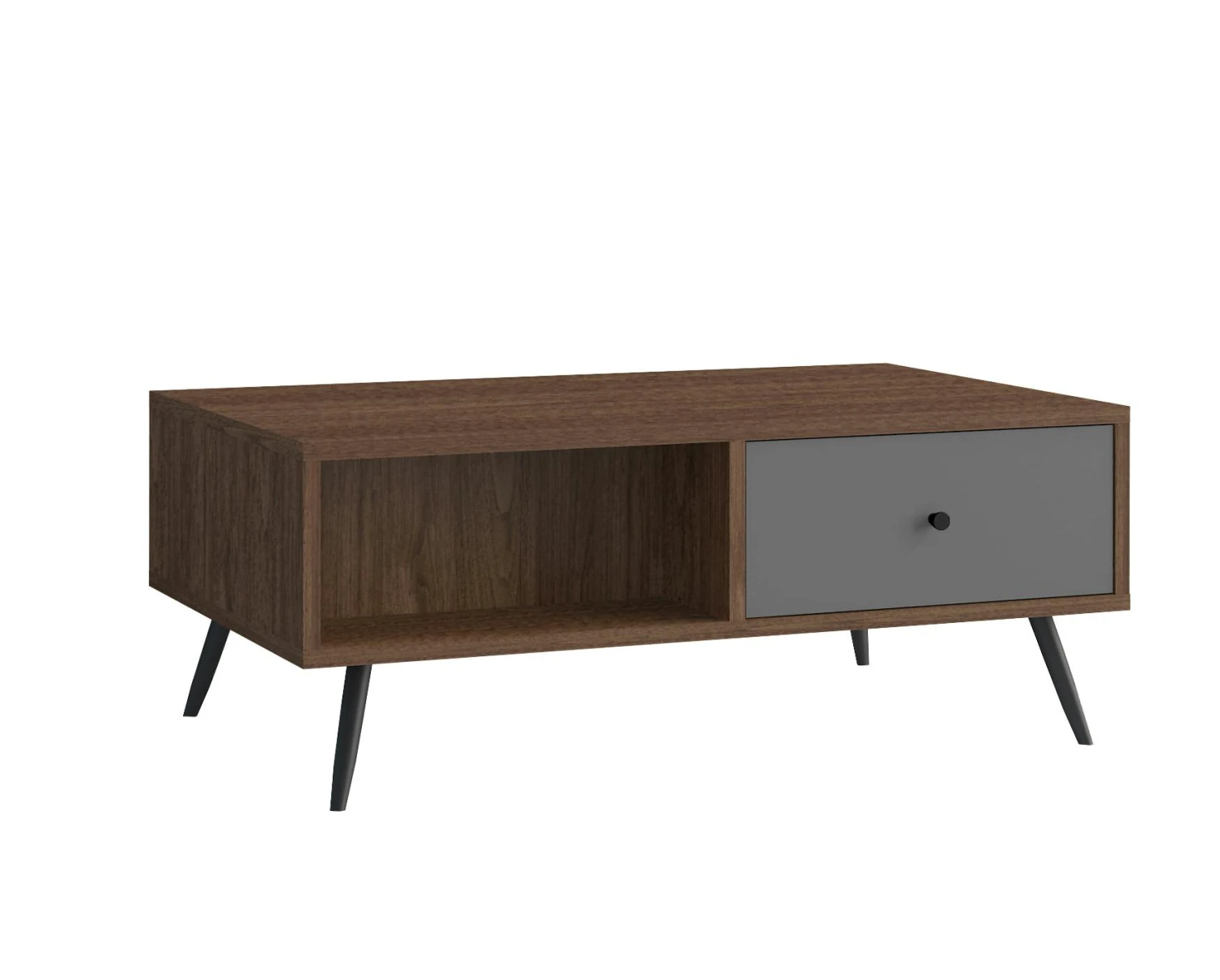 Das geradlinige Design des Couchtisches vereint walnussfarbenes und graues MDF-Holz mit matt schwarz lackierten Metallfüßen. Der Couchtisch bietet mit einem offenen Fach und einer Schublade reichlich Stauraum für Fernbedienungen, Zeitschriften und Co. Auf der Deckplatte finden Blumen, Obstschalen oder andere Dekoartikel ihren Platz. Die Füße aus Metall in matt schwarz sorgen für einen festen Stand. Ein perfekter Tisch für einen gemütlichen TV-Abend. Dieses schicke Möbelstück lässt sich mit seinem minimalistischen Stil in jedes Wohnzimmer integrieren und bleibt trotzdem immer ein Hingucker. Der Couchtisch ist einfach die ideale Ergänzung für Ihre Einrichtung!