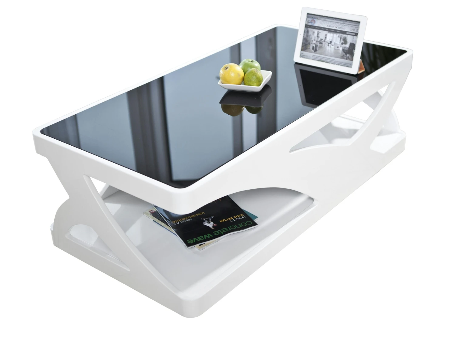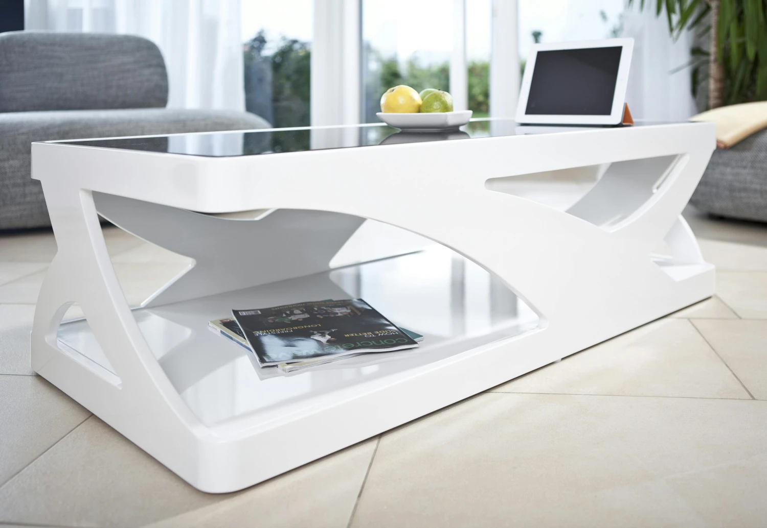 Der rechteckige Couchtisch vereint modernes Design mit einer Portion Extravaganz. Der komplette Tisch wurde aus MDF hergestellt und in Hochglanz weiß lackiert. Die aufliegende 10 mm Glasplatte ist schwarz und wurde aus Sicherheitsglas gefertigt. Das Design Schmuckstück fällt vor allem durch sein einzigartiges Design sofort ins Auge, aber auch praktische Zwecke sind hier bei der Herstellung nicht außer Acht gelassen worden. So bieten sich genügend Ablagemöglichkeiten für z.B. Zeitschriften, Fernbedienungen, Handy etc..