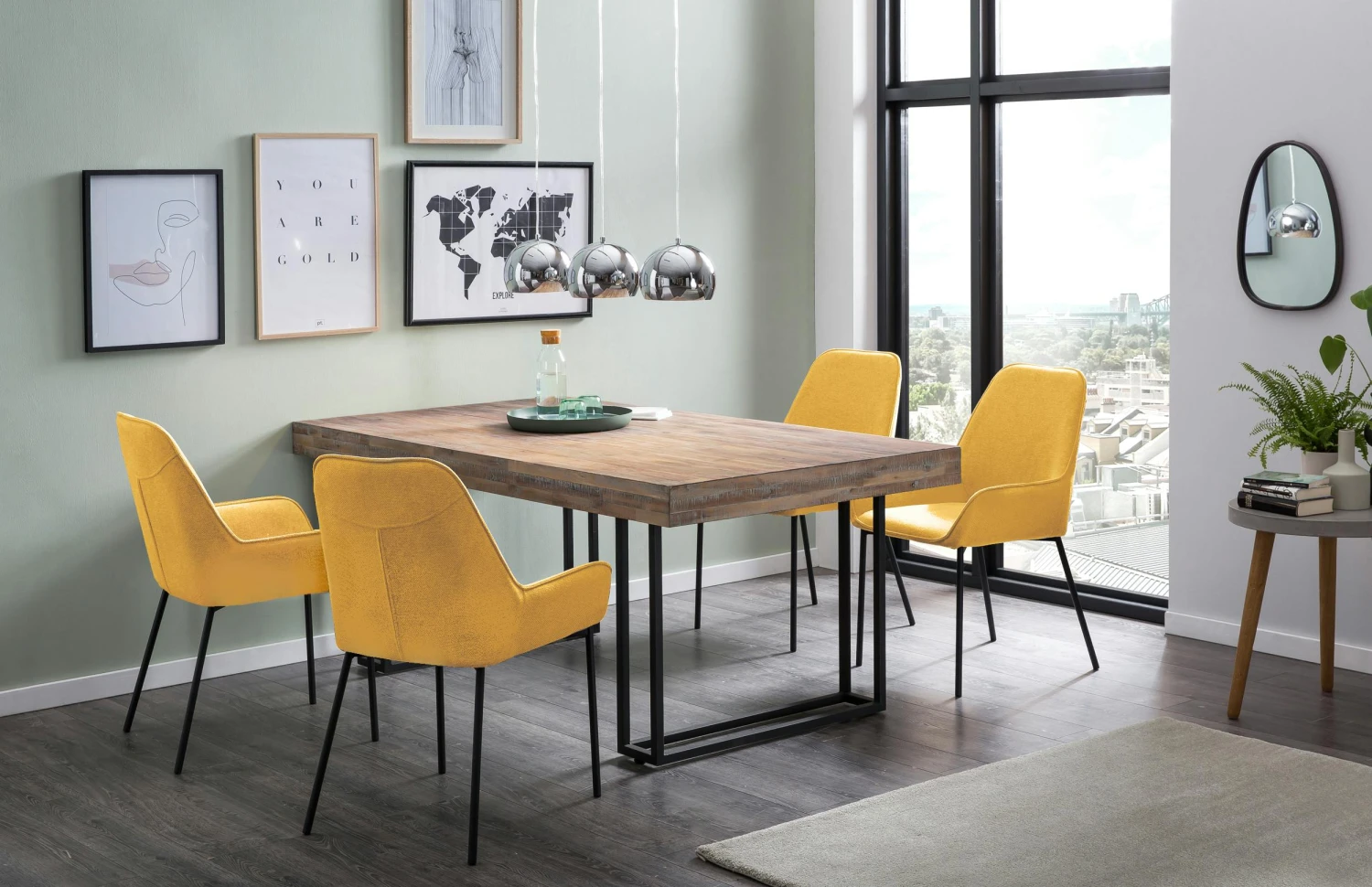 Die 5-tlg. Essgruppe besteht aus einem Esstisch mit Metallgestell und 4 Esszimmerstühlen. An dieser 5-tlg. Tischgruppe bietet sich genügend Platz für Ihre Familie und Gäste. Die edlen Esszimmerstühle besitzen einen hochwertigen Bezug aus groben Strukturstoff, sowie Stuhlbeine aus pulverbeschichtetem Metall in Mattschwarz. Durch die bequeme Polsterung, die Rückenlehne und die Armlehnen entsteht ein angenehmer Sitzkomfort der Extraklasse. Das Stuhlmodell punktet nicht nur durch sein modernes Aussehen, sondern auch mit Qualität und Strapazierfähigkeit. Die 10 cm starke Tischplatte wurde aus Akazie gefertigt und harmonisiert perfekt mit dem Metallgestell in Schwarz. Einen besonderen Akzent verleiht dem Esstisch seine schöne Optik. In Kombination mit dem farblich abgesetzten Tischgestell und der naturfarbenen Tischplatte, ist der Tisch ein optisches Highlight in Ihrem Esszimmer. Durch seine zeitlose Optik lässt sich das Set optimal mit weiteren Möbelstücken und Einrichtungsstilen kombinieren.