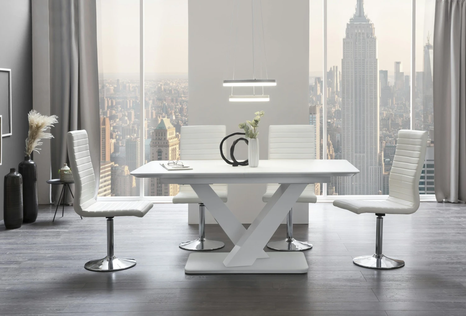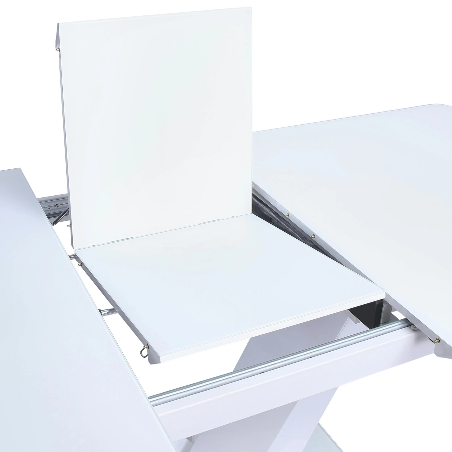Das neue Herzstück in Ihrem Essbereich ist dieser weiße Esstisch. Die Tischplatte wurde aus MDF Holz gefertigt und wird abgerundet durch 5 mm Sicherheitsglas. Der Sockel ist ebenfalls aus MDF und Glas. Dies sieht nicht nur stylisch aus, es verleiht dem Tisch auch eine sehr gute Stabilität. Möbel in weiß sehen nicht nur freundlich aus und sind voll im Trend, sie passen auch nahezu in jedes Interior. Egal wo Sie diesen Tisch einsetzen, ob Esszimmer oder Geschäftsräume, er ist mehr als nur ein Sitzplatz zum Essen. Hier können ausgedehnte Gesprächsrunden mit Freunden, Familie oder Geschäftspartnern geführt werden. Sollte der Platz einmal nicht ausreichen, können Sie den Tisch dank Ausziehfunktion erweitern.