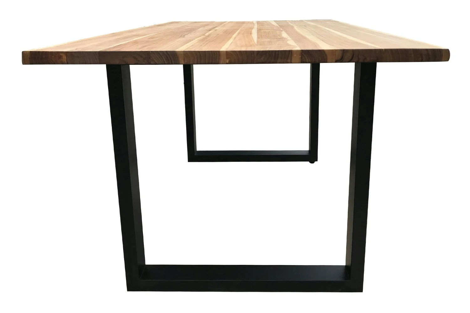 Massivholzmöbel gehören zu den zeitlos schönen Möbeln, die niemals aus der Mode kommen. Die 35 mm dicke Tischplatte besteht aus Teakholz und wurde aus echter Baumkante gefertigt. Das U-Gestell aus schwarz lackiertem Metall verleiht dem Tisch eine sehr gute Stabilität und ist das passende Gegenstück zur schönen naturfarbenen Tischplatte. Dieser Esszimmertisch ist mehr als nur ein Sitzplatz zum Essen. Holen Sie sich ein Stück Natur in die eigenen vier Wände. Da es sich bei diesem Massivholztisch um ein Naturprodukt handelt, kann es zu Astlöchern oder unterschiedlichen Farbschmückungen kommen, welche jedoch keine Fehler darstellen, sondern den individuellen Charakter des Echtholzes unterstreichen. Auch die Tiefe kann aufgrund der unregelmäßigen und asymmetrischen Formgebung um mehrere Zentimeter variieren. Alle diese Unterschiede machen diesen Esstisch zu einem echten Unikat.