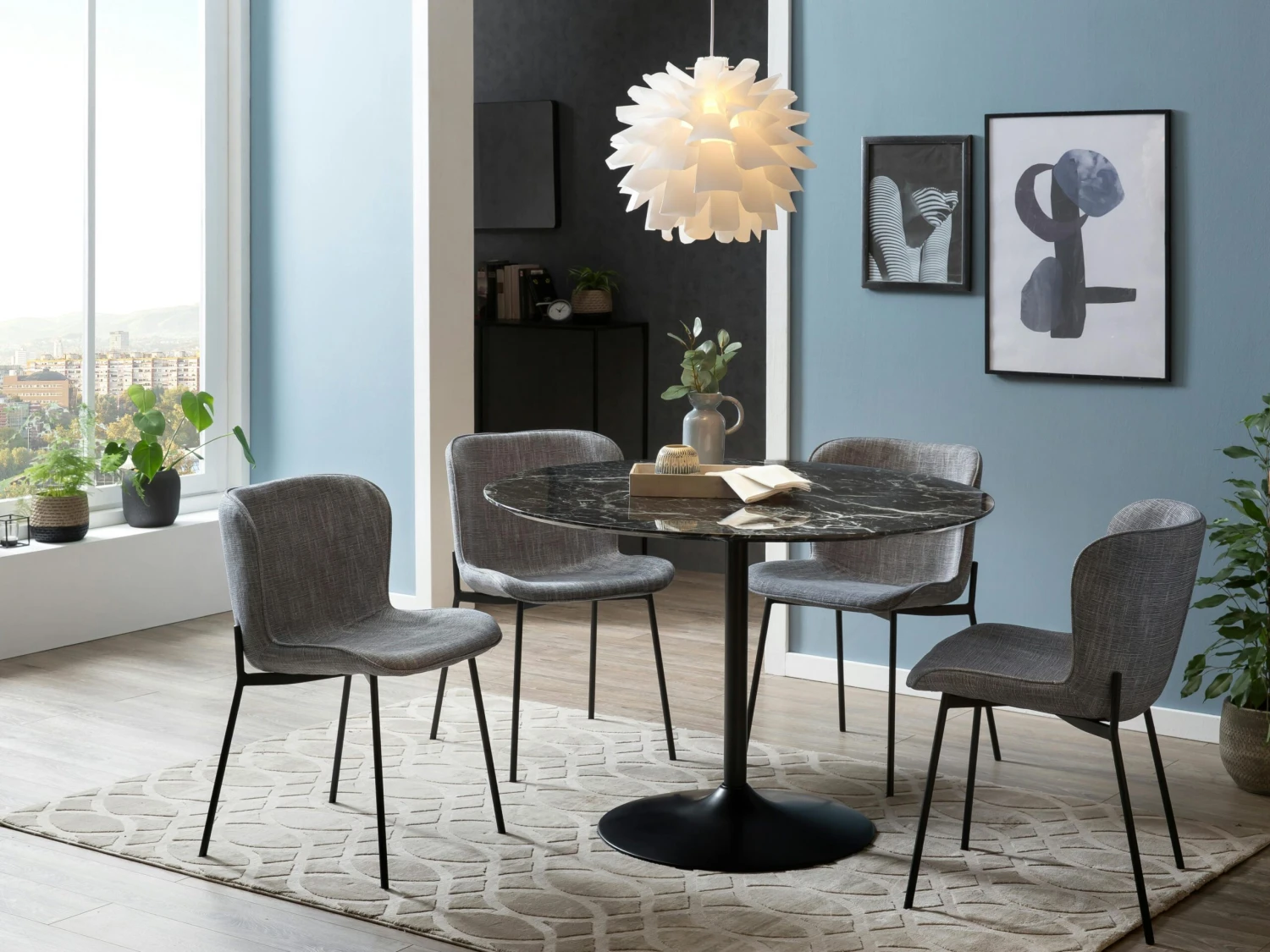 Das neue Herzstück in Ihren Essbereich. Die runde Tischplatte wurde aus MDF Holz gefertigt und in Marmoroptik foliert. Mit einem Durchmesser von 110 cm bietet sie ausreichend Platz für bis zu 4 Personen. Der Tischfuß aus schwarz pulverbeschichtetem Metall hat einen Durchmesser von 6 cm und verleiht dem Tisch eine sehr gute Stabilität. Möbel in Marmor-Optik sind voll im Trend und passen nahezu in jedes Interior. Zudem passt die Farbe Schwarz nahezu in alle Räumlichkeiten. Egal wo Sie diesen Tisch einsetzen, ob Esszimmer oder Bistro, er ist mehr als nur ein Sitzplatz zum Essen. Hier können ausgedehnte Gesprächsrunden mit Freunden oder Familie geführt werden.