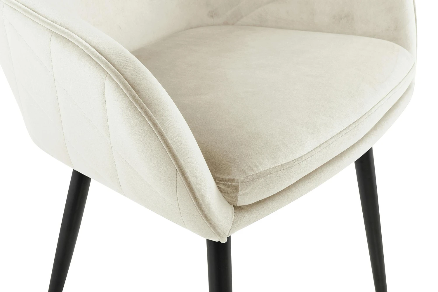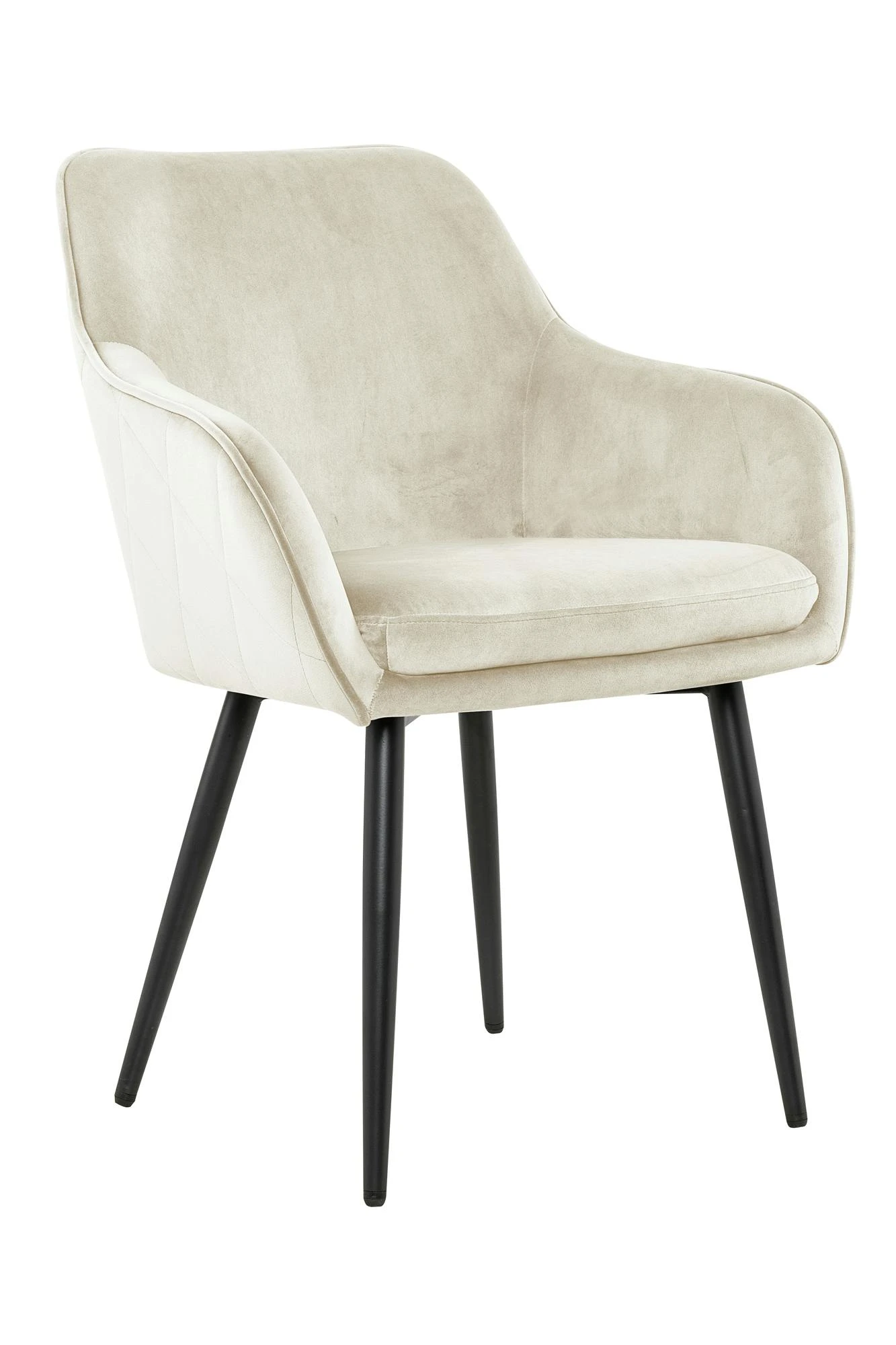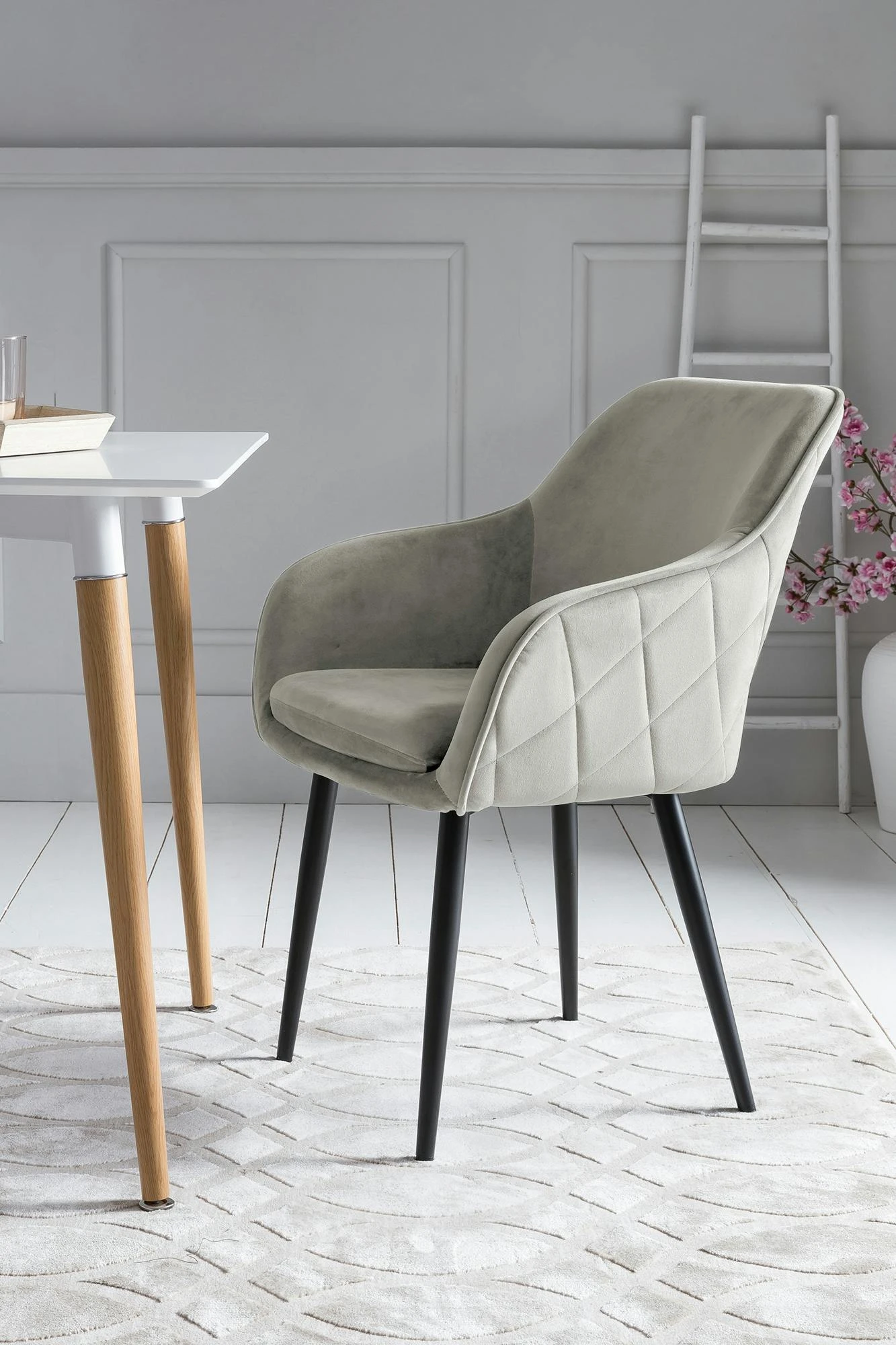 Der moderne Polsterstuhl besticht durch seinen Stoffbezug in Samt-Optik und überzeugt mit seiner Polsterung an Sitz- und Rückenfläche. Das leicht ausgestellte 4 Fuß Gestell aus schwarzem Metall ist höhenverstellbar und gewährleistet nicht nur einen sicheren Stand, sondern bietet auch einen großartigen Kontrast zum Bezug des Stuhles. Durch die bequeme Polsterung, die Rückenlehne und die Armlehnen entsteht ein angenehmer Sitzkomfort der Extraklasse. Das optische Highlight ist die Diamantensteppung, welche sich über den äußeren Sitz- und Rückenbereich erstreckt.