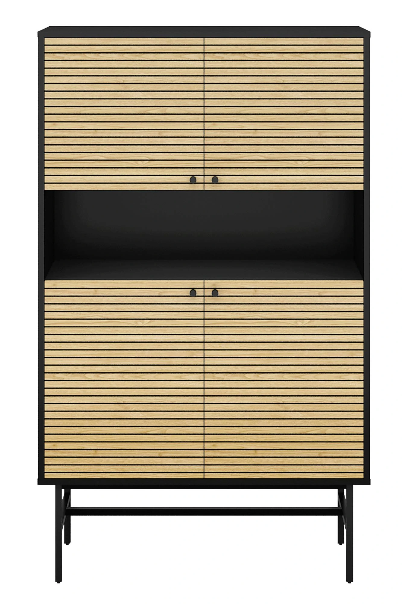 Skandinavischer Stil modern interpretiert! Dieses Highboard bietet Ihnen schlichte nordische Eleganz. Die Kombination zwischen dem schwarzen Korpus aus MDF-Holz mit Melaminbeschichtung und dem Eiche Echtholzfurnier bildet einen großartigen Kontrast. Die MDF-Holz Front ist mit Eiche Echtholzfurnier ausgestattet und ist somit ein echter Blickfang. Hinter vier Türen verbirgt sich ausrauchend geschlossener Stauraum für die verschiedensten Sachen. Das offene Fach in der Mitte können Sie für diverse Deko-Artikel wunderbar nutzen. Egal ob in Ihrem Wohnzimmer oder in Ihrem Esszimmer – mit dem Highboard stehen Ihnen alle Möglichkeiten offen!