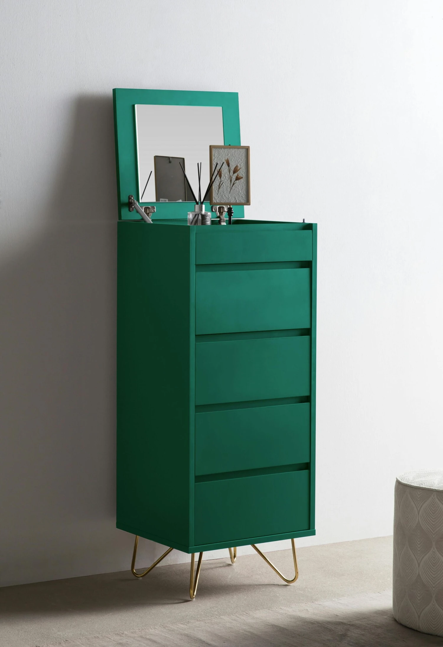 SalesFever Kommode Hoch | 4 Schubladen Und 1 Fach | Inkl. Spiegel | Beine Metall Mit Messinglegierung | B 45 X T 40 X H 110 Cm | Grün