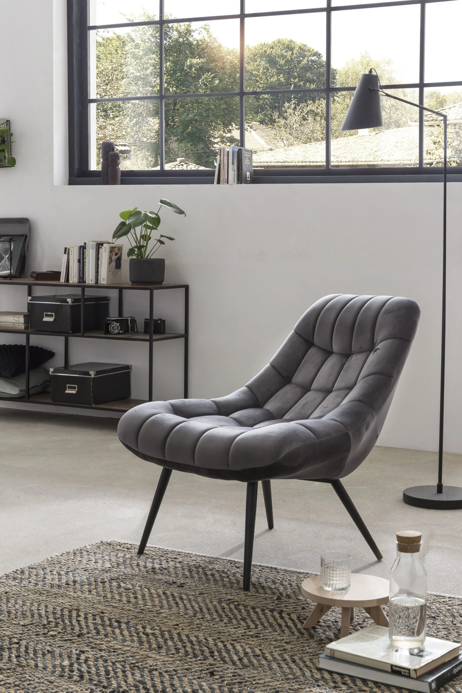 Dieser graue Polstersessel besticht durch sein skandinavisches Design. Dank der XXL Sitzfläche erhalten Sie ein komfortables Sitz- und Loungegefühl. Besonderes Highlight ist die auffällige Steppung, die dem Sessel ein loftiges Flair verleiht. Die filigranen Füße sind ein toller Kontrast zum üppigen Samtstoff. Der Sessel ist frei im Raum stellbar und kann wunderbar in ein bestehendes Raumkonzept integriert werden, denn es wertet Ihren Wohnraum stilvoll auf. Die schwarzen Beine sind aus pulverbeschichtetem Metall gefertigt.