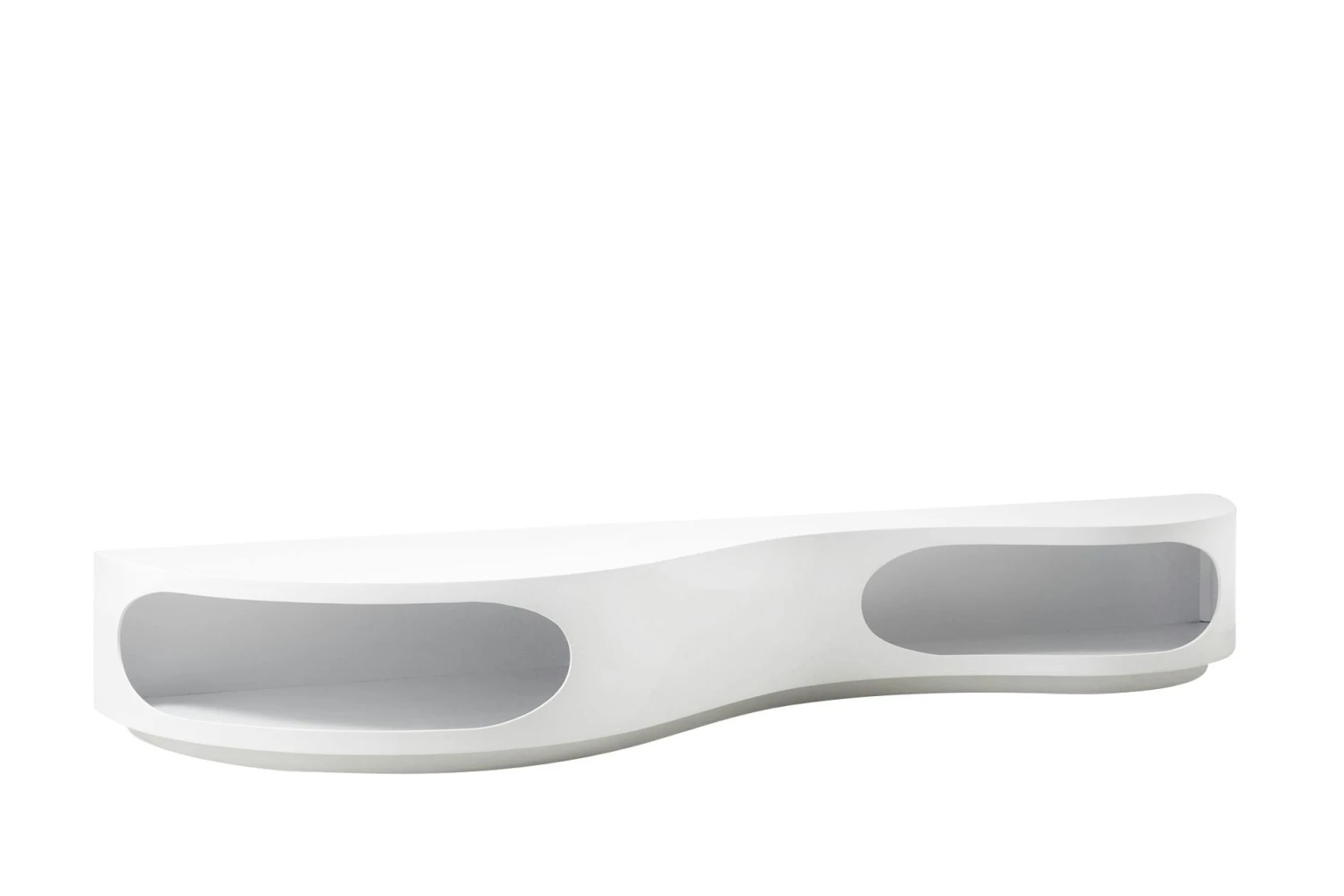 Das weiße Lowboard Tchouc aus der Möbelserie Allant bietet ein außergewöhnliches Design. Die asymmetrischen Aussparungen in der leicht geschwungenen Form bieten Platz für Bücher, Dekorationsartikel und allerlei mehr.