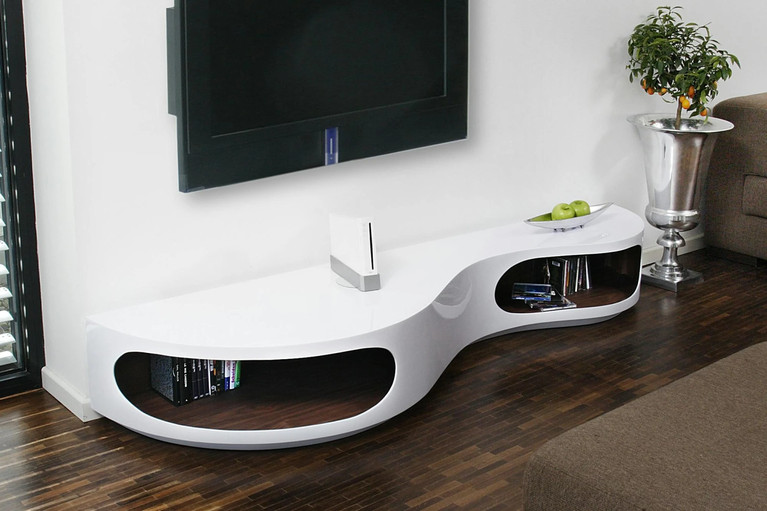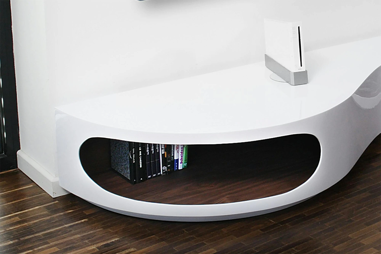Das Lowboard Tchouc aus der Möbelserie Allant bietet ein außergewöhnliches Design. Die weiße Oberfläche steht in Kontrast zu der dunklen walnussholzfarbenen inneren Fläche. Die asymmetrischen Aussparungen in der leicht geschwungenen Form bieten Platz für Bücher, Dekorationsartikel und allerlei mehr.