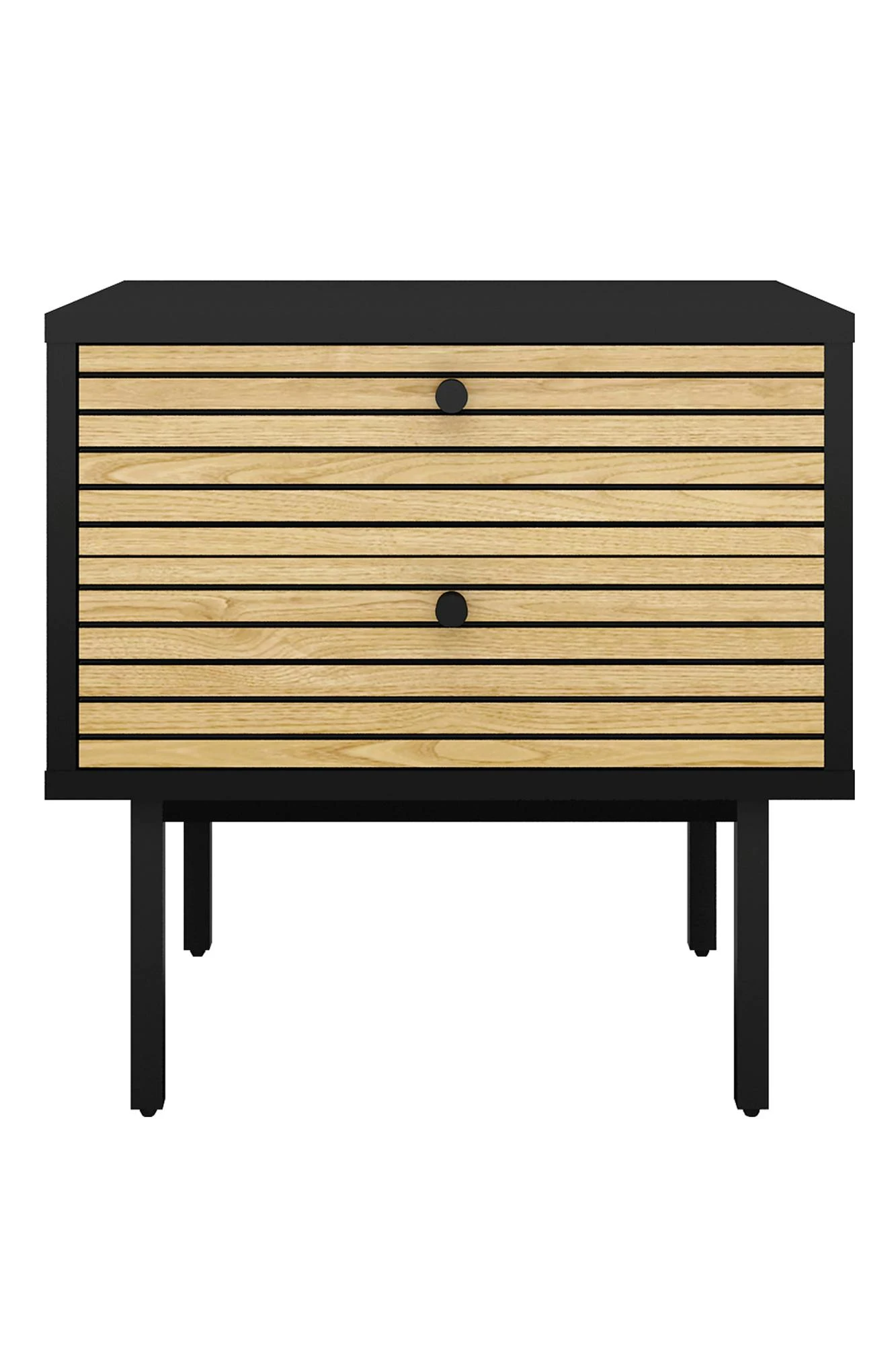 Skandinavischer Stil modern interpretiert! Die Nachtkommode bietet Ihnen schlichte nordische Eleganz. Die Kombination zwischen dem schwarzen Korpus aus MDF-Holz mit Melaminbeschichtung und dem Eiche Echtholzfurnier bildet einen großartigen Kontrast. Die MDF-Holz Front ist mit Eiche Echtholzfurnier ausgestattet und ist somit ein echter Blickfang. Hinter 2 Schubladen bietet sich genügend geschlossener Stauraum für die verschiedensten Sachen. Die Ablagefläche auf der Nachtkommode kann wunderbar für eine Nachtischlampe genutzt werden. Lassen Sie sich mit der Nachtkommode ins Land der Träume entführen. Das Schränkchen kann auch als Beistellkommode in Flur, Diele, Wohnzimmer oder einem anderen Raum zum Einsatz kommen. Der Nutzung sind hier fast keine Grenzen gesetzt.