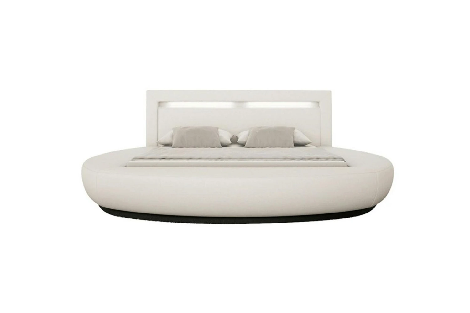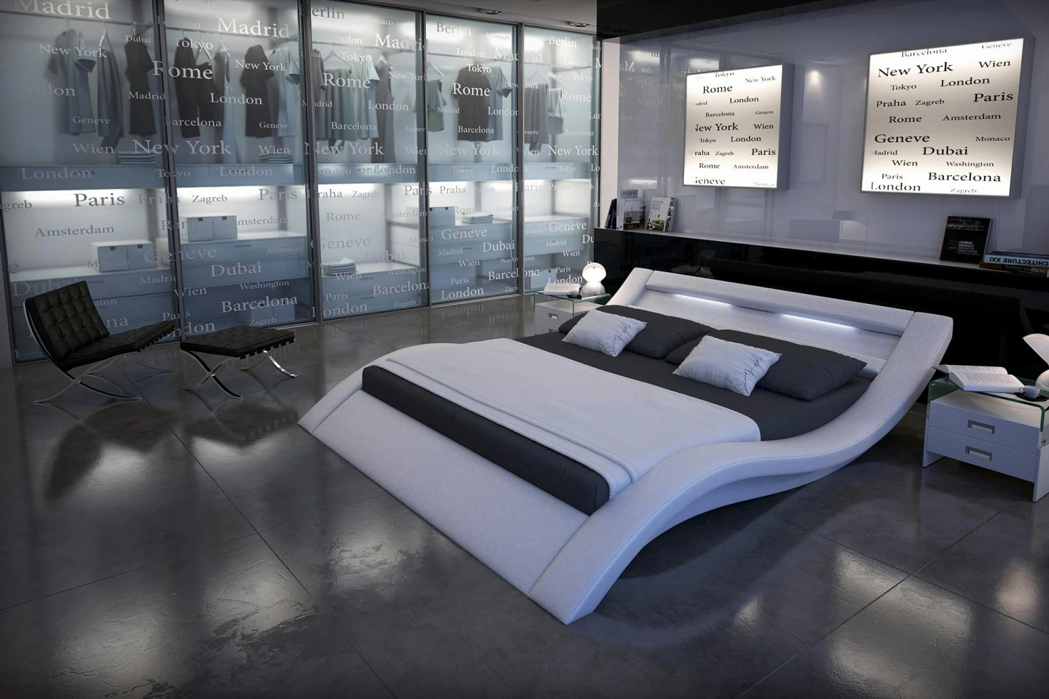Das moderne Polsterbett in weiß überzeugt mit seiner geschwungenen Linienführung. Der schicke Bezug besteht aus pflegeleichtem Kunstleder. Das Bett ist mit einer freitragenden Mittelstrebe ausgestattet. Nutzen Sie die Möglichkeit zwei kleine Matratzen oder eine große mit unterschiedlichem Härtegrad zu verwenden. Gerade als Paar mit unterschiedlichen Schlafgewohnheiten ist dies ein großer Vorteil. Besonders raffiniert sind die zwei LED-Lichtleisten, die in das Kopfteil eingearbeitet sind. Sie sorgen für eine angenehm warme Stimmung in Ihrem Schlafraum und eignen sich für lange Fernseh- und Leseabende. Mit diesem Design-Highlight erschaffen Sie sich eine individuelle Ruhezone in Ihrem Schlafzimmer.