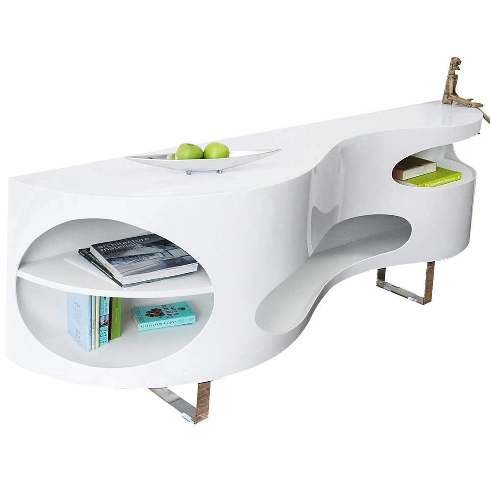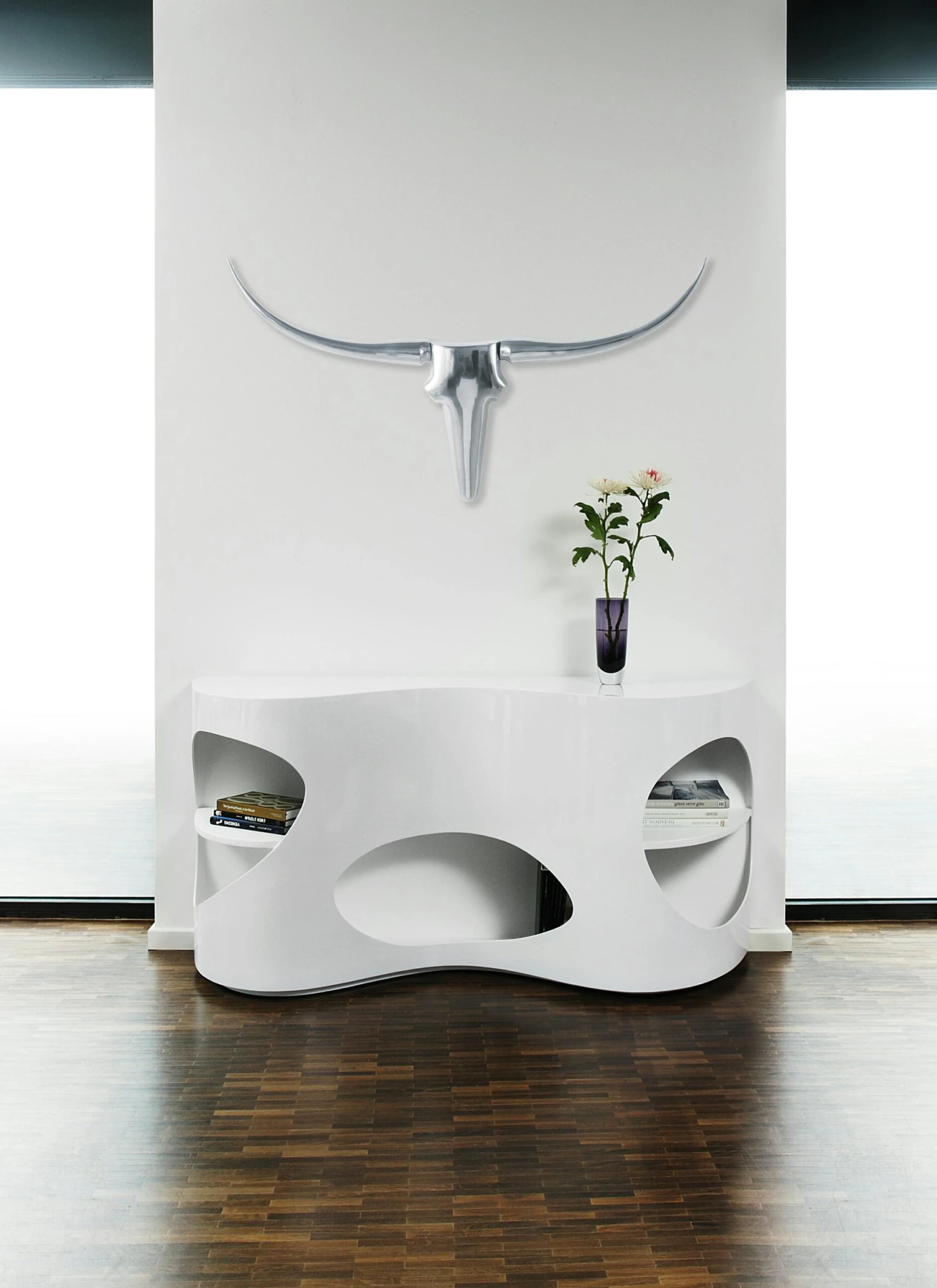 Das Sideboard Tchouc aus der Möbelserie Allant bietet ein außergewöhnliches Design. Die weiß Oberfläche steht in Kontrast zu der matten inneren Fläche. Die asymmetrischen Aussparungen in der leicht geschwungenen Form bieten Platz für Bücher, Dekorationsartikel und allerlei mehr.