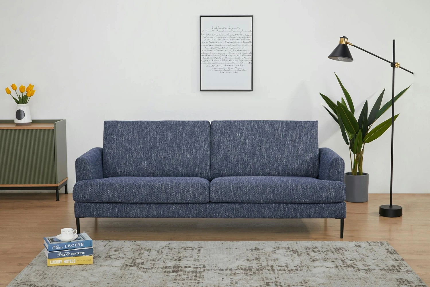 Das 3-Sitzer Sofa im modernen Design präsentiert sich mit einem stilvollen Bezug aus Strukturstoff und überzeugt mit seiner abgeschrägten Rückenlehne. Das hohe 4 Fuß Gestell aus schwarzem Metall gewährleistet nicht nur einen sicheren Stand, sondern bietet auch einen großartigen Kontrast zum Bezug des Sofas. Durch die Polsterung an Sitz- und Rückenfläche, die hohen Armlehnen und die stylische Form erhalten Sie einen Entspannungsfaktor der Extraklasse. Dieses Polstersofa wird zu Ihrem neuen Wohlfühl-Platz.